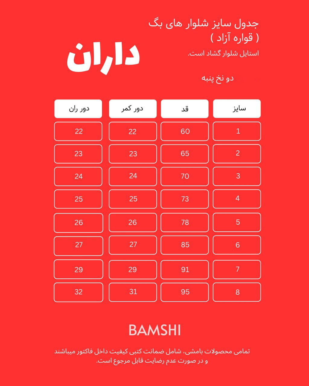 شلوار مدل داران اورسایز: دارای دو جیب - گلدوزی BAMSHI بالای شلوار - دارای بند برای تنظیم سایز