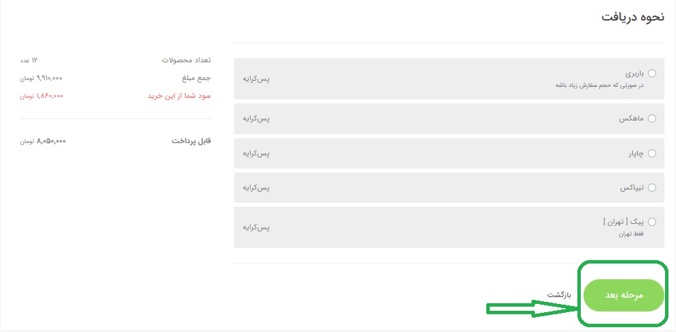سپس روش ارسال کالا (ماهکس، پیک برای تهران، تیپاکس و باربری برای اقلام زیاد) را انتخاب نمایید.