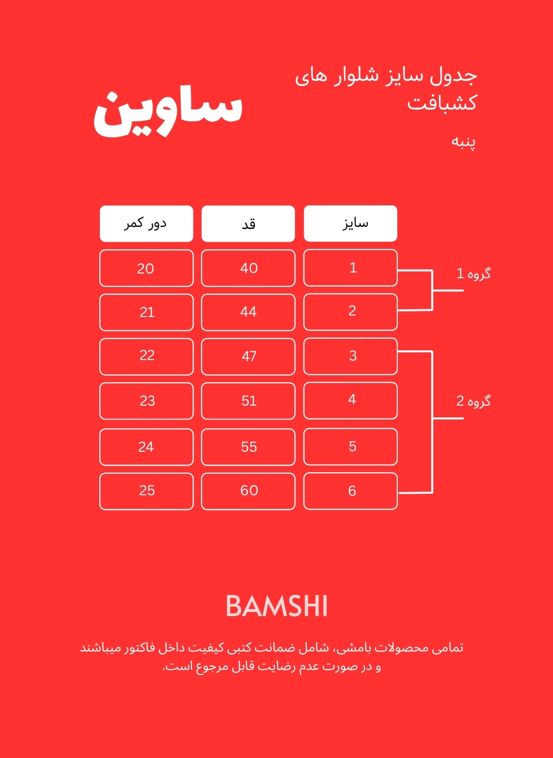 شلوار کشبافت کبریتی پنبه مدل ساوین در چهارده رنگ جذاب، مناسب پاییز و زمستان است. این شلوار کبریتی نرم و لطیف با گرمای ایده‌آل با تنخور شیک، برای استایل روزمره پیشنهاد خوبی بشمار می‌آید. شلوار مدل ساوین در 2 گروه عرضه شده است. گروه اول در بسته‌بندی دو عددی (سایز 1.2) مناسب سیسمونی بوده و گروه دوم در بسته‌بندی چهار عددی (سایزهای 3.4.5.6) موجود هست. از سایت بامشی بهترین خدمات - کیفیت ثابت - سرویس سریع و پشتیبانی واقعی دریافت می‌کنید. توجه فرمایید نسبت به نور محیط عکاسی شده، رنگ محصولات تا چند درجه با واقعیت مغایرت خواهد داشت. همچنین بابت انتخاب سایز مناسب از جدول سایزبندی؛ مغایرت جزئی را در نظر بگیرید.