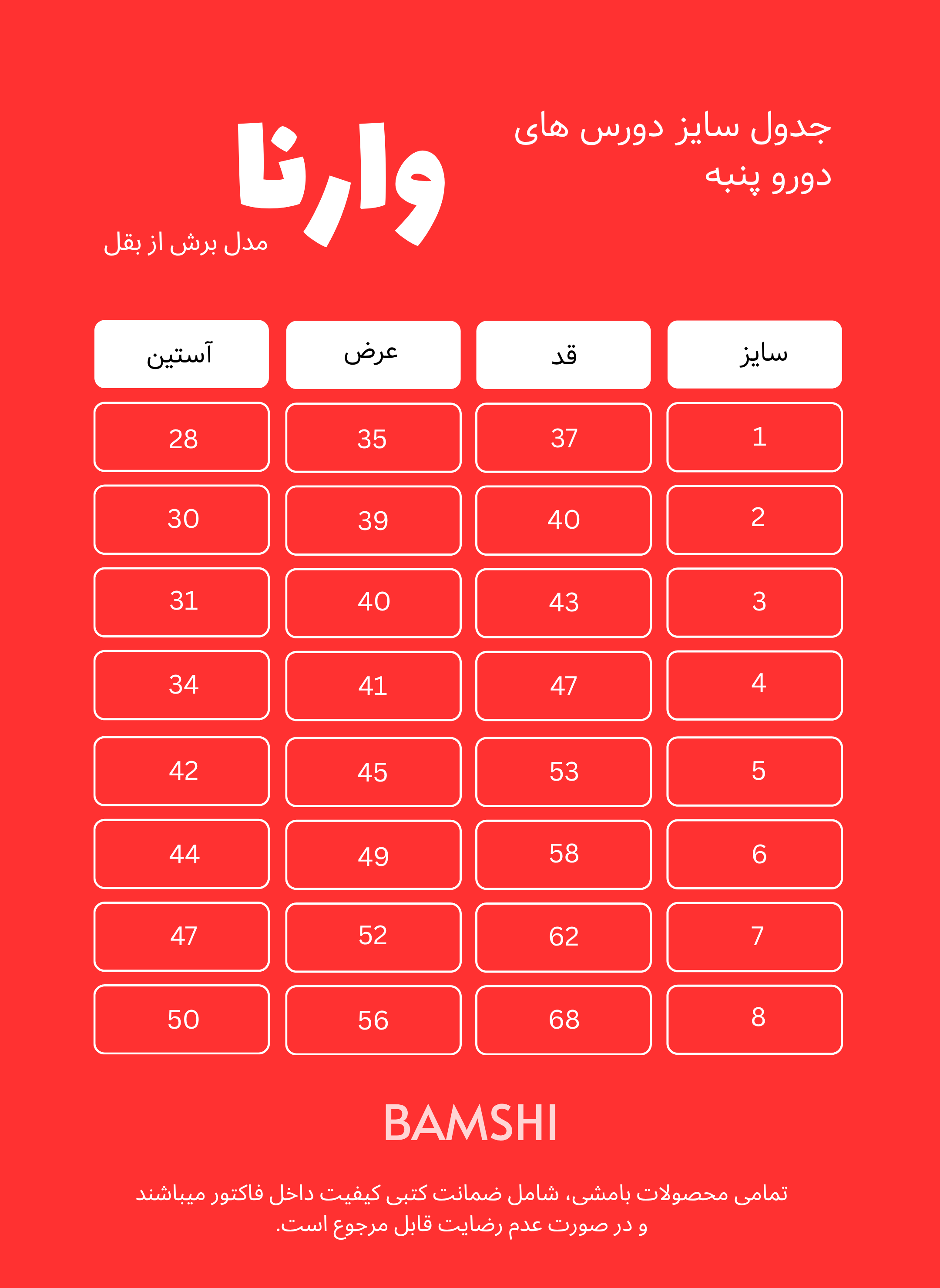 ۱.۲ ( سایز ۳۷-۴۰ ) | ۳.۴ ( سایز ۴۳-۴۷) | ۵.۶ ( سایز ۵۳-۵۸) | ۷.۸ ( سایز ۶۲-۶۸)